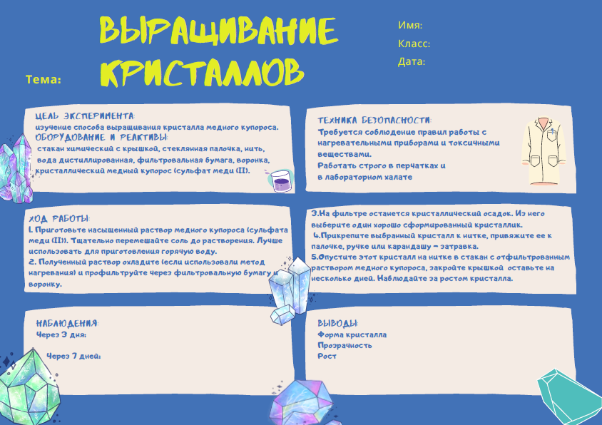 Данный лист эксперимента оформлен для мини-исследования по химии для учеников 7 класса "Выращивание кристаллов". Учитель может распечатать данный лист как для работы в классе, так и отправить ученикам для работы дома.