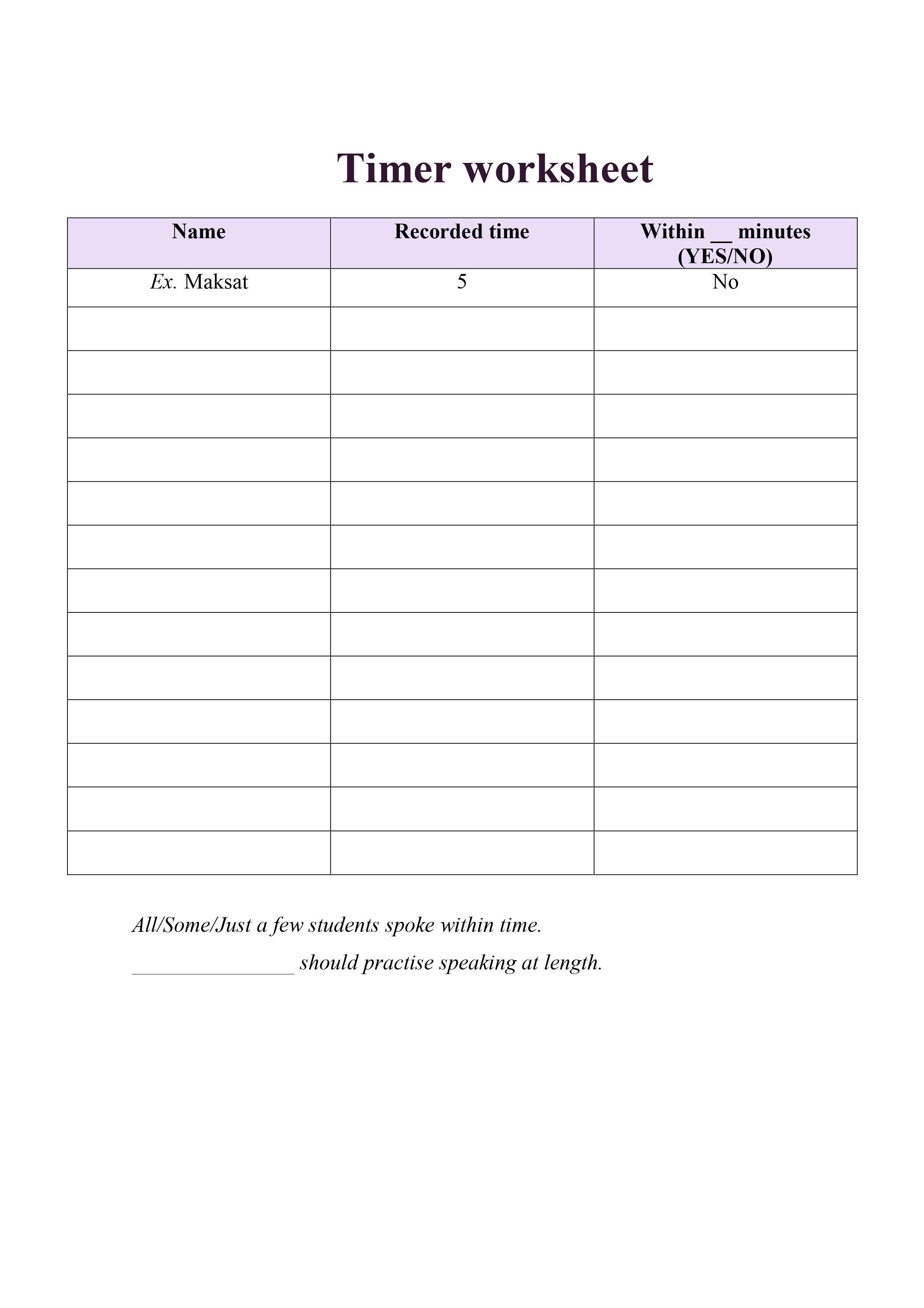 During the speaking activity, you may give your students certain roles (Timer, General Evaluator, and so on).