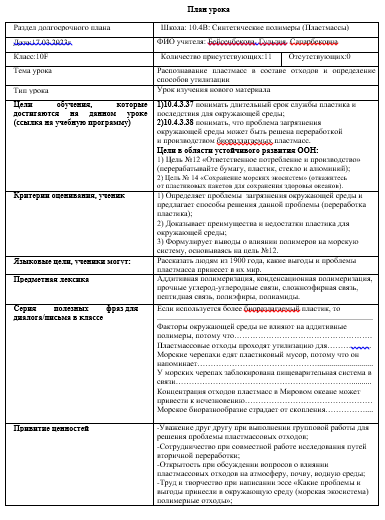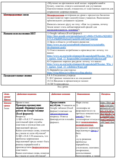 Ответы проверялись через марк-схему, а также проведено обсуждение любых других ответов. Оценивание прогресса учебных достижений учащихся важный процесс урока. В течении урока применялись подходы проблемно-ориентированного обучения, которые направили учащихся на самостоятельное исследование образовательных ресурсов, анализ изученного материала, умения работать с ключевыми понятиями академического языка предмета и формулирование вывода по исследуемой проблеме. На этапе решения поставленной проблемы: "С какими проблемами в мире связаны цели №12 и №14 в области устойчивого развития ООН?Проведена интеграция между целями обучения образовательной программы:10.4.3.37 понимать длительный срок службы пластика и последствия для окружающей среды и 10.4.3.38 понимать, что проблема загрязнения окружающей среды может быть решена переработкой и производством биоразлагаемых пластмасс, и целями в области устойчивого развития ООН: цель №12 «Ответственное потребление и производство» (перерабатывайте бумагу, пластик, стекло и алюминий) и цель № 14 «Сохранение морских экосистем» (откажитесь от пластиковых пакетов для сохранения здоровья океанов).Учащиеся рассматривали пути решения мировой проблемы пластмассовых отходов и их влияние на окружающую среду. На следующем этапе урока проведена групповая работа. Выполнение заданий проводится по станциям: №1- Биоразложение, №2- Пластмассовые отходы, №3- Окружающая среда. Задания для групп расположены на станциях. Заполнение ответов проводится на Google таблице (Excel формате). Цели работы: 1)Объясняют биоразложение/ бионеразлагаемлость;2)Предлагают жизнеспособные пути решения проблемы;3)Доказывают небиоразлагаемость аддитивных полимеров;4)Объясняют причину биоразлагаемости конденсационных полимеров;5)Аргументируют влияние пластика на окружающую среду. На этапе закрепления пройденного материала учащиеся решали проблемные вопросы: 1)Ответственное потребление и производство. Почему это важно? Заполняли таблицу, отвечая на вопросы: Чем я могу помочь как предприниматель?. Чем я могу помочь как потребитель?; 2) Сохранение морских ресурсов: почему это важно?. Заполняли таблицу, отвечая на вопросы: Кажется, морские ресурсы действительно стоит охранять. В чем же заключается проблема?. Что же мы можем сделать? Цели работы: 1) Предлагают переход к рациональным моделям потребления и производства;2) Аргументируют использование экологических материалов, не приносящих ущерб окружающей среде; 3) Объясняют жизнеспособные меры по защите окружающей среды от переизбытка отходов; 4) Приводят факты по поддержанию океанов в здоровом состоянии, что способствует борьбе с изменением климата и адаптации к нему; 3) Предлагают, виды сбора мусора в океанах и их вторичную переработку для сохранения биоразнообразия морской системы. На этапе рефлексии по предложенному рисунку собирали три пакета из данных предметов на картине: Пакет №1 - из полимерных упаковок и выясни их состав; Пакет №2 - из бумажных упаковок и выясни их состав; Пакет №3 - из продуктов питания и выясни их состав. Задание: Выберите по 2 полимера с каждого пакета, и выясните сходства и различия между ними. Цель работы: 1) Закрепить полученные знания;2) Выясняют состав полимеров и их маркировку на товарах;3) Проводят сравнения полимеров и выявляют сходства и отличия.