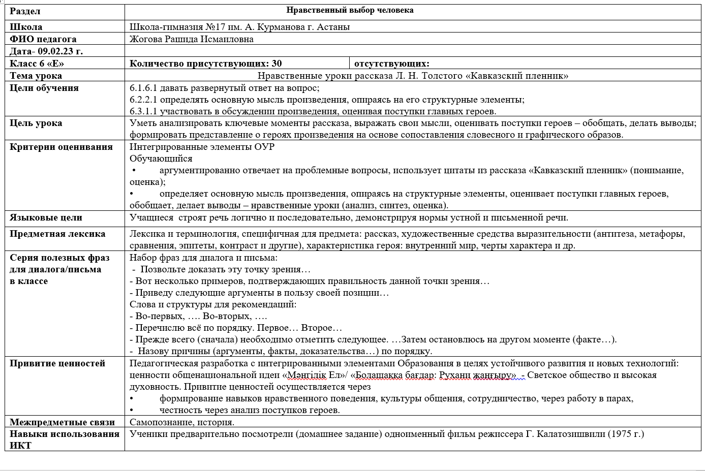 КРАТКОСРОЧНЫЙ ПЛАН УРОКА ЛИТЕРАТУРЫ "НРАВСТВЕННЫЕ УРОКИ РАССКАЗА Л.Н. ТОЛСТОГО "КАВКАЗСКИЙ ПЛЕННИК" С ИНТЕГРИРОВАННЫМИ ЭЛЕМЕНТАМИ ОУР