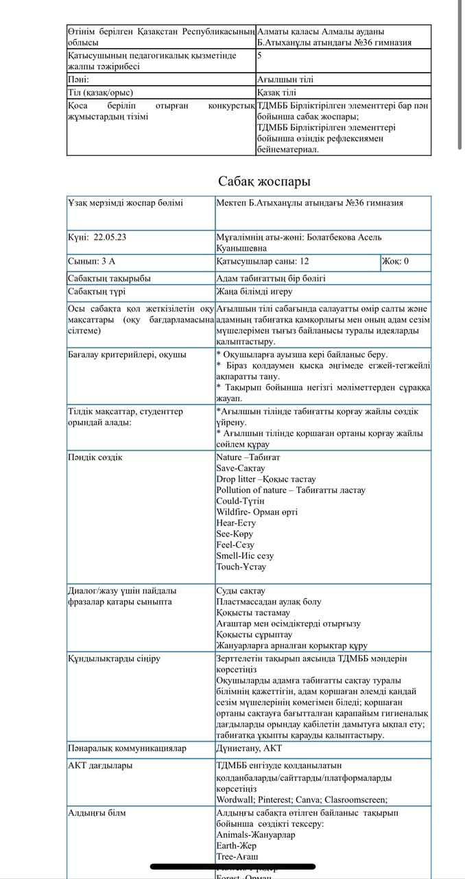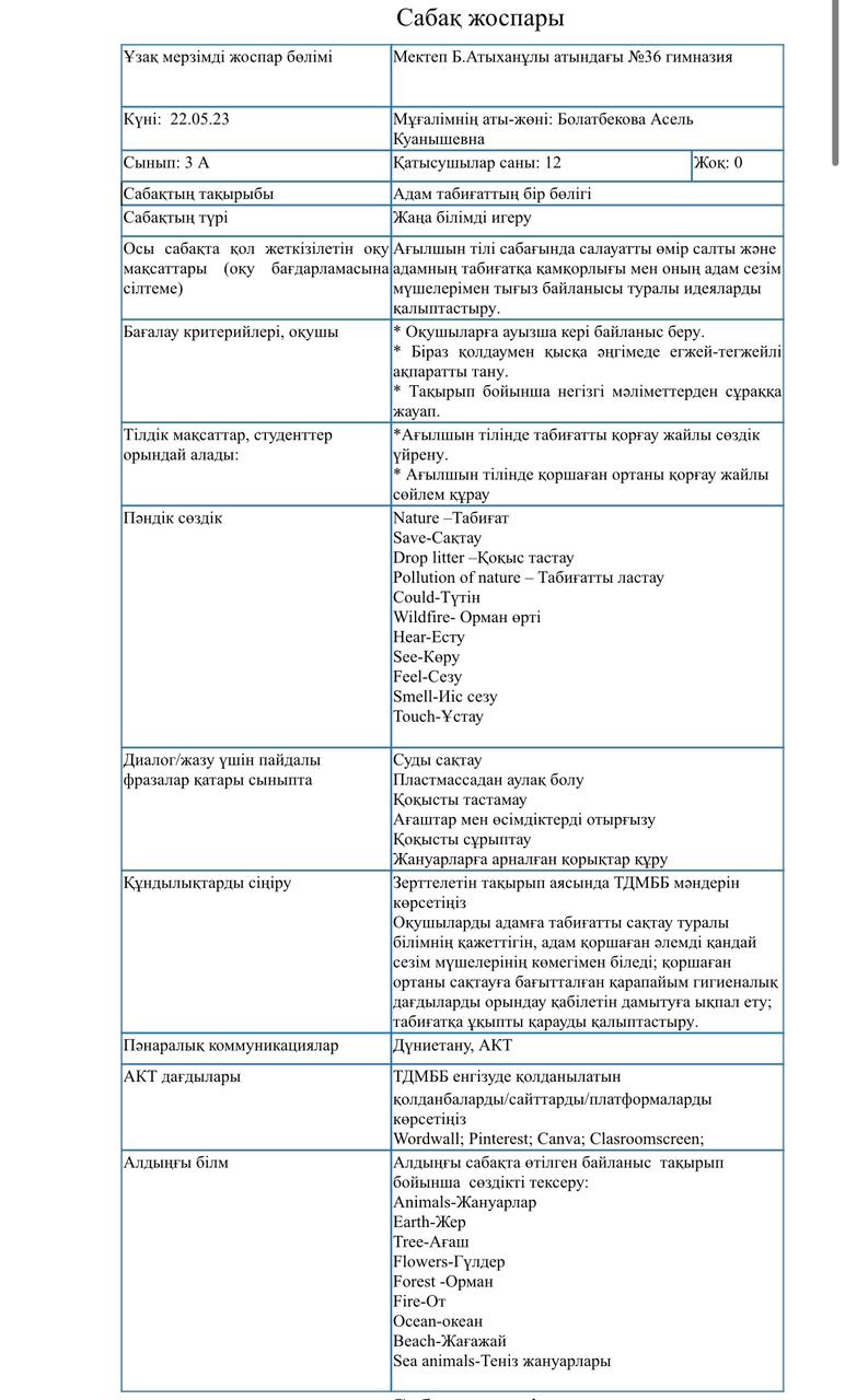 ТДМББ бірліктірілген элементтері бар ағылшын тілі пәні бойынша сабақ жоспары