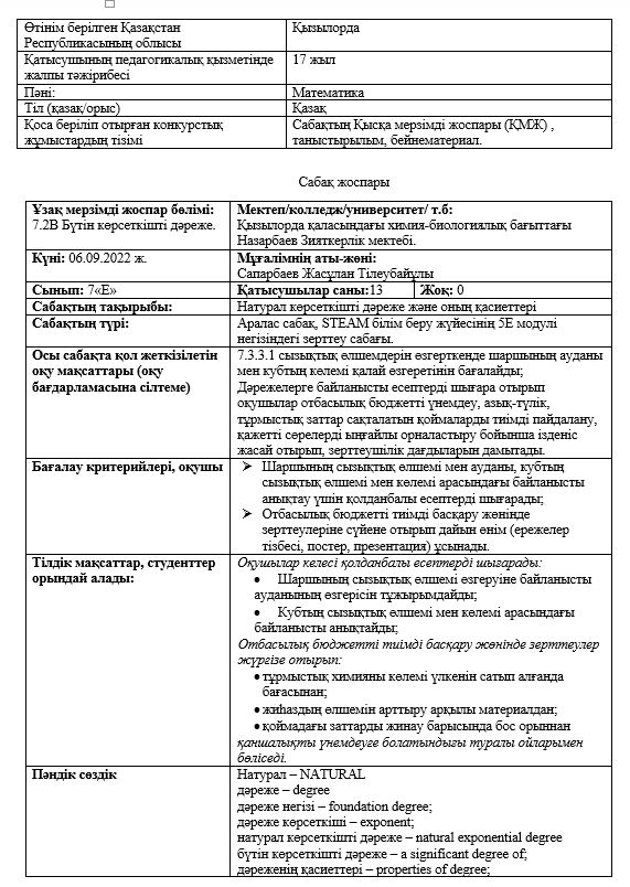 Оқу мақсаты: 7.3.3.1 сызықтық өлшемдерін өзгерткенде шаршының ауданы мен кубтың көлемі қалай өзгеретінін бағалайды; Дәрежелерге байланысты есептерді шығара отырып оқушылар отбасылық бюджетті үнемдеу, азық-түлік, тұрмыстық заттар сақталатын қоймаларды тиімді пайдалану, қажетті сөрелерді ыңғайлы орналастыру бойынша ізденіс жасай отырып, зерттеушілік дағдыларын дамытады.