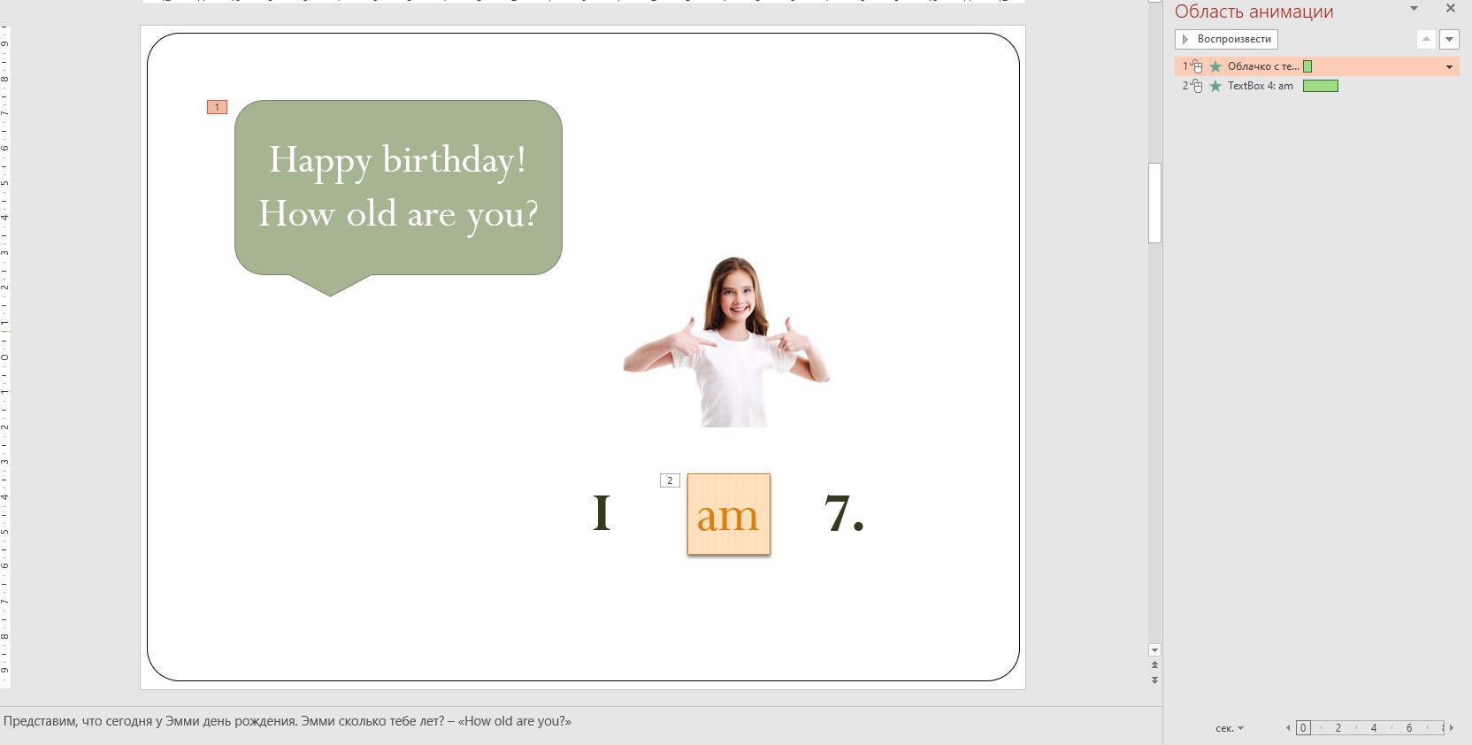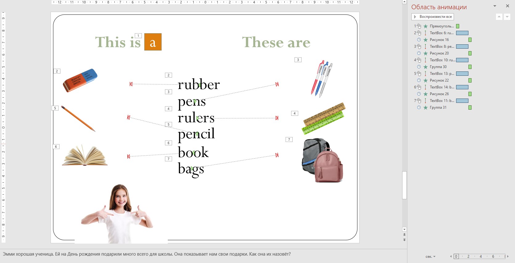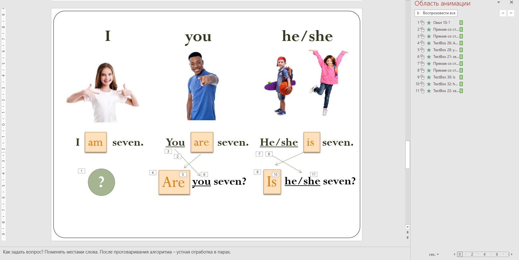 Слайды с анимацией, что предполагает, что дети сначала озвучивают свой ответ, затем верный ответ появляется на экране.