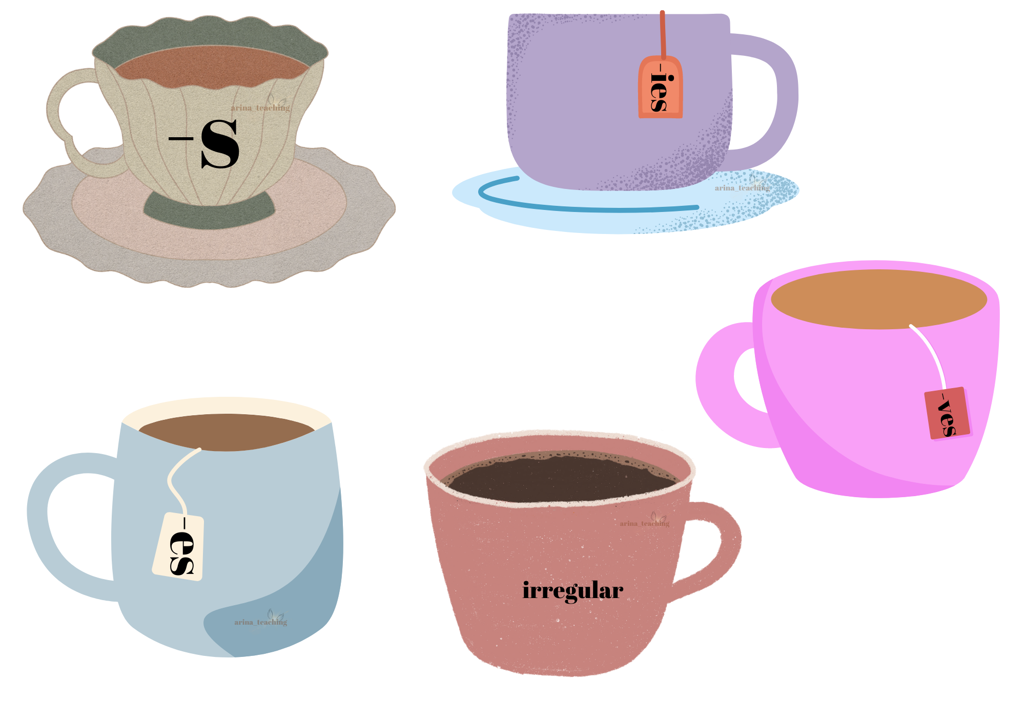 Раскладываем на столе чашки и печенье. Задача игроков как можно быстрее рассортировать окончания.