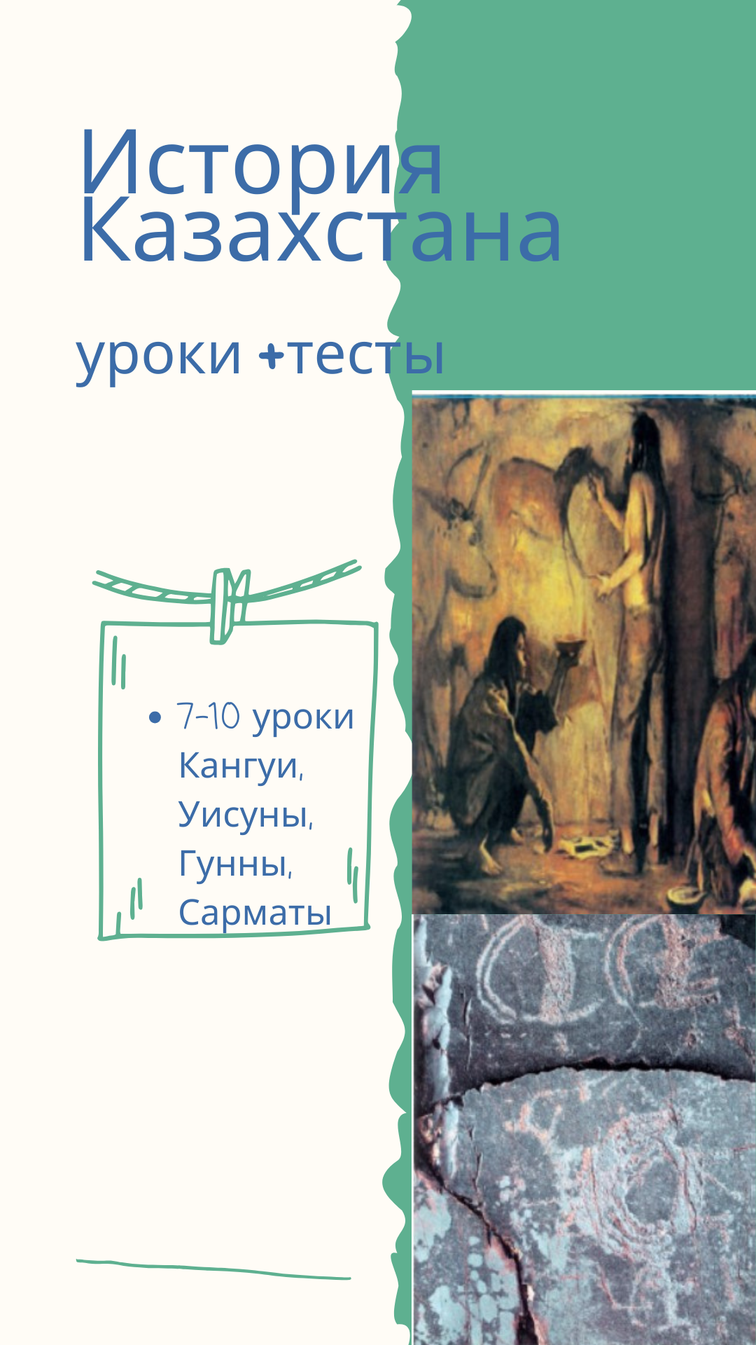 Тесты обширные охватывает все периоды истории. Условна названа 1-3 уроки Палеолит, мезолит. Неолит, Энеолит, Бронза. 4-6 уроки Саки, 7-10 уроки Кангуии, Уисуны, Гунны, Сарматы. 11-14 уроки Тюрки до 13 века
