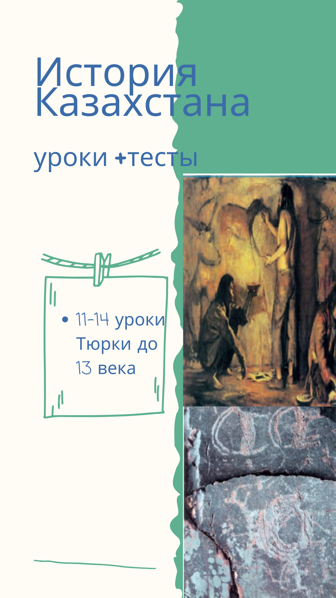 Тесты обширные охватывает все периоды истории. Условна названа 1-3 уроки Палеолит, мезолит. Неолит, Энеолит, Бронза. 4-6 уроки Саки, 7-10 уроки Кангуии, Уисуны, Гунны, Сарматы. 11-14 уроки Тюрки до 13 века