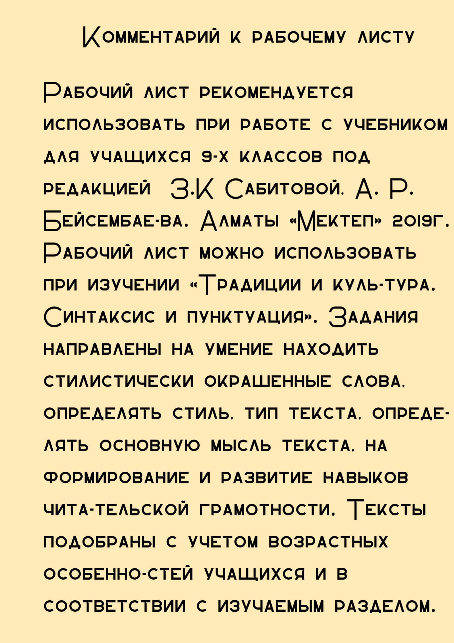 Рабочий лист разработан для формирования и развития читательской грамотности учащихся 9 класса. Задания связаны с темой раздела: «Традиции и культура. Синтаксис и пунктуация» и с темой урока: «Национальная специфика культуры. Стилистически окрашенные слова». С помощью рекомендуемого рабочего листа достигаются следующие цели обучения: