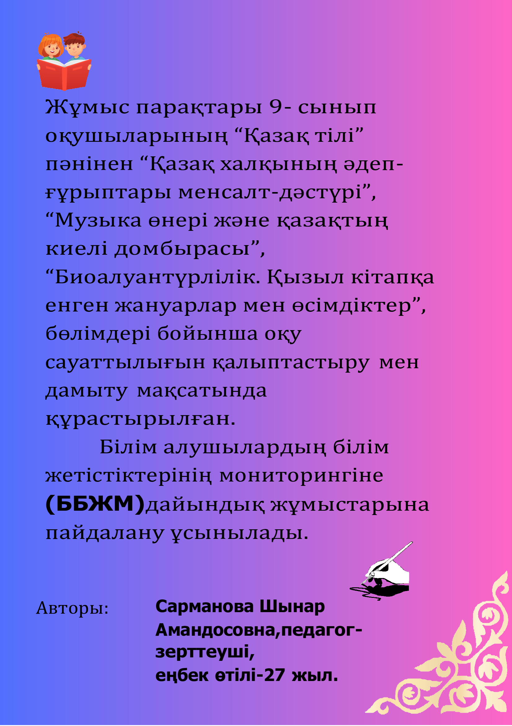 В предлагаемой разработке даны тексты и тесты по ним, которые созданы в формате Мониторинга образовательных достижений обчающихся.Рабочие листы разработаны на казахском языке, содержат в себе цель обучения, название темы раздела и урока.
