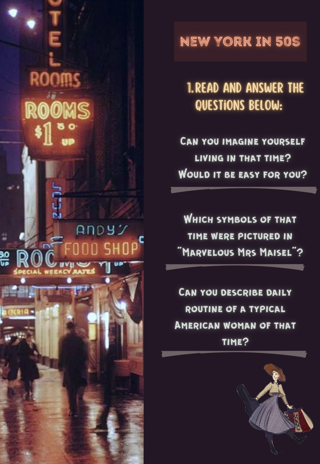 Материалом рабочей тетради послужил первый эпизод сериала "The Marvelous Mrs Maisel". Рабочий материал включает в себя рабочую тетрадь для ученика + материалы для учителя + материалы для домашней работы. Настоятельно рекомендую ознакомиться с материалами для учителя прежде чем выстраивать занятие.