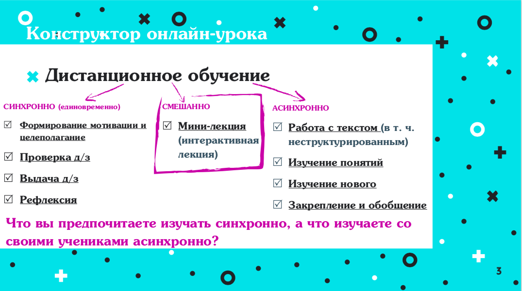 Методический конструктор онлайн-урока представляет собой презентацию в формате pdf с гипертекстовыми ссылками, в которой на 150 слайдах представлены: приемы, методы и цифровые ресурсы, которые можно использовать при проектировании и проведении онлайн-уроков как в режиме реального времени, так и асинхронно.