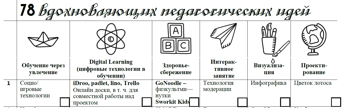 Чеклист – это контрольный список, где 78 вдохновляющих идей распределены по шести ключевым трендам образования: обучение через развлечение, цифровое обучение, здоровьесберегающие технологии, интерактивное занятие, визуализация и проектное обучение