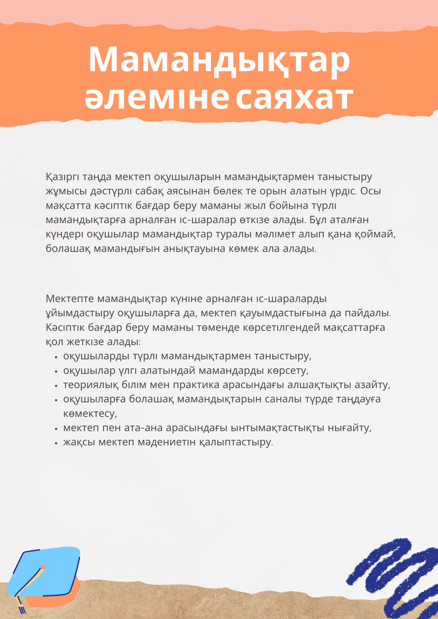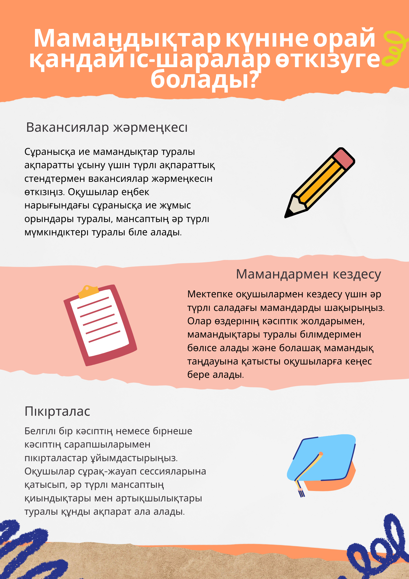 Бұл жинақта кәсіптік бағдар беру маманы Мамандықтар Күніне орай мектепте өткізе алатын іс-шаралар ұсынылған.