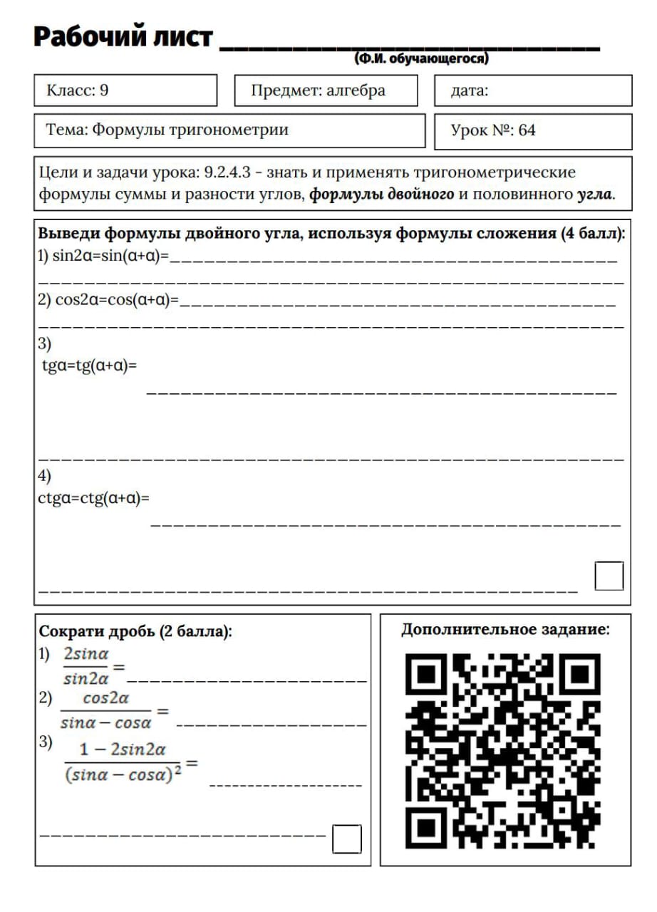 В структуре рабочих листов имеются цели обучения, задания для отработки практических навыков, QR-коды с ссылками на интерактивные задания или онлайн-тесты и рефлексия деятельности обучающегося.