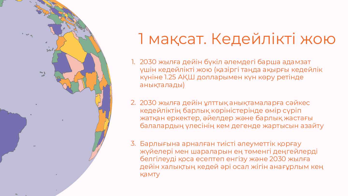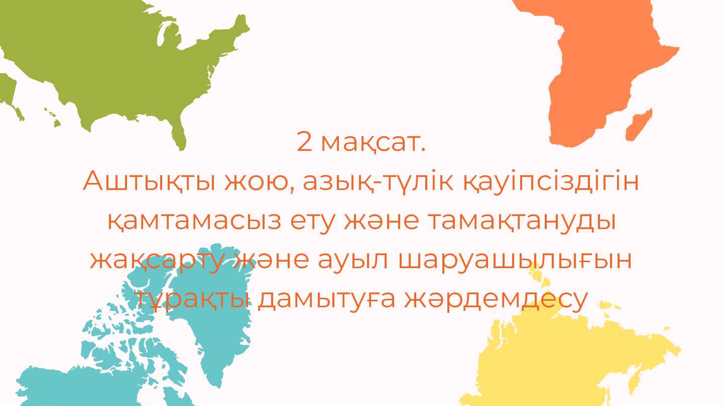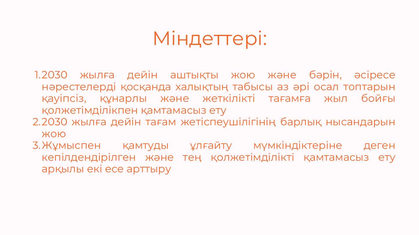 2030 жылға дейін аштықты жою және бәрін, әсіресе нәрестелерді қосқанда халықтың табысы аз әрі осал топтарын қауіпсіз, құнарлы және жеткілікті тағамға жыл бойғы қолжетімділікпен қамтамасыз ету 1. 2030 жылға дейін тағам жетіспеушілігінің барлық нысандарын жою 2. Жұмыспен қамтуды ұлғайту мүмкіндіктеріне деген кепілдендірілген және тең қолжетімділікті қамтамасыз ету арқылы екі есе арттыру