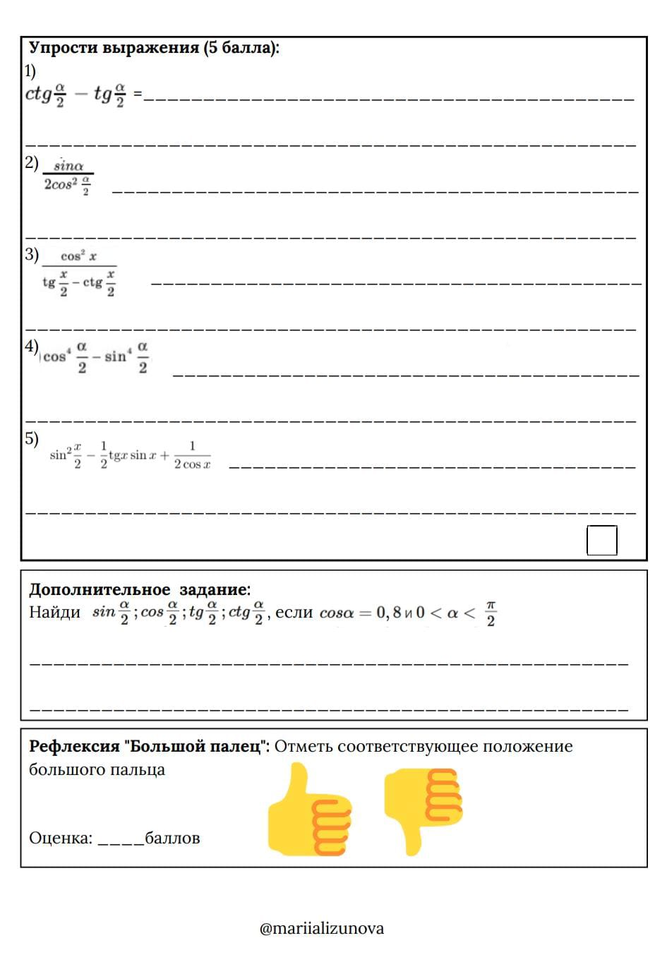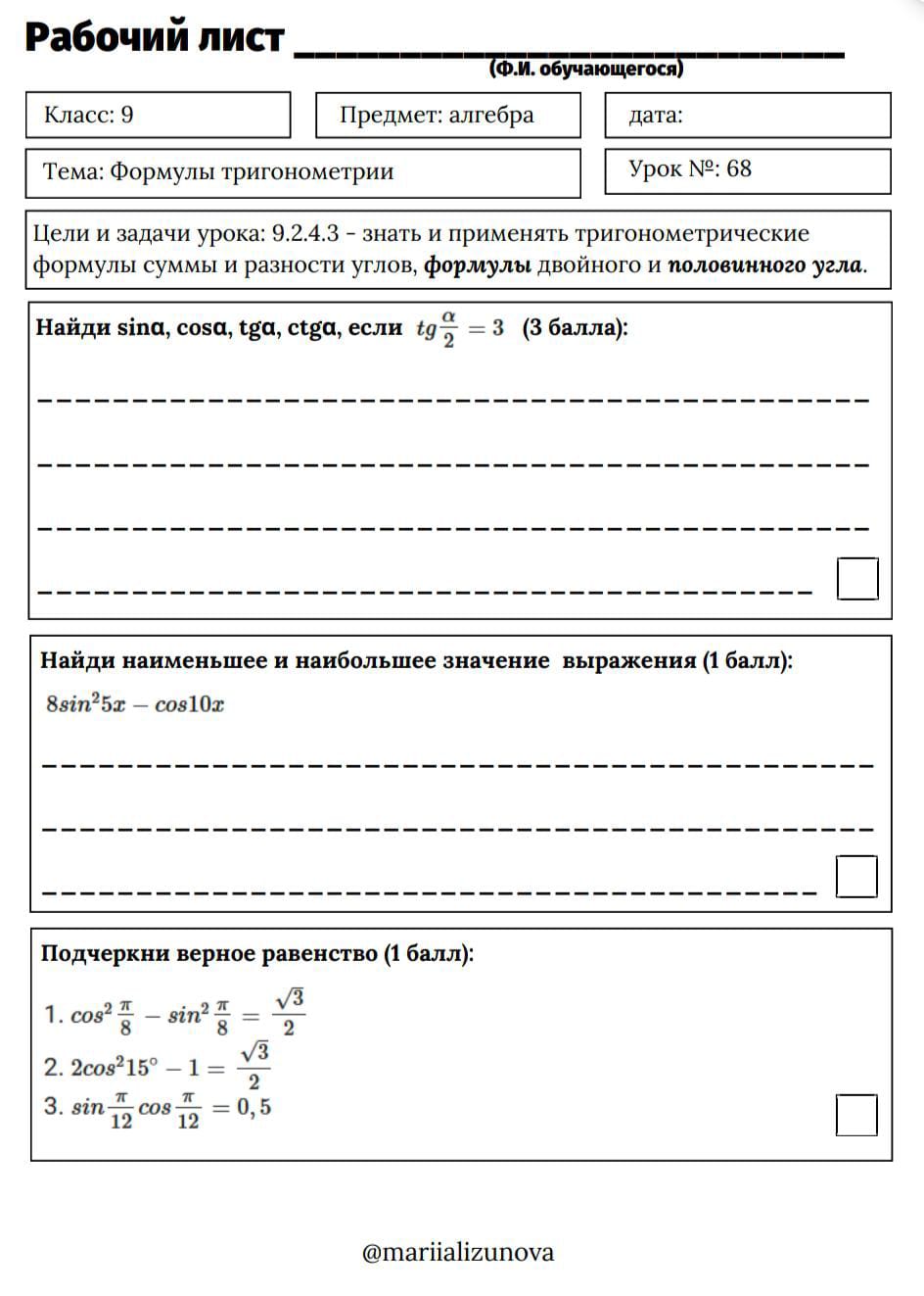Набор рабочих листов по теме "Формулы половинного угла" состоит из 3 рабочих листов с разнообразными заданиями для достижения следующих целей обучения: