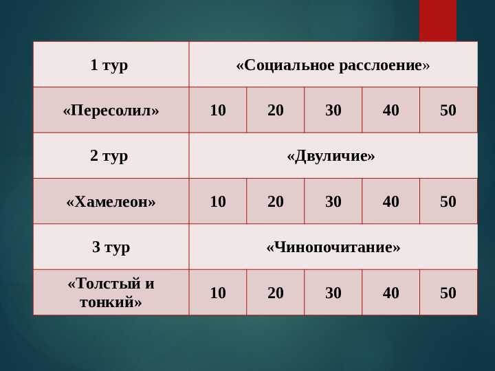 - Каждая команда выбирает вопрос из предложенных категорий с разной стоимостью баллов.