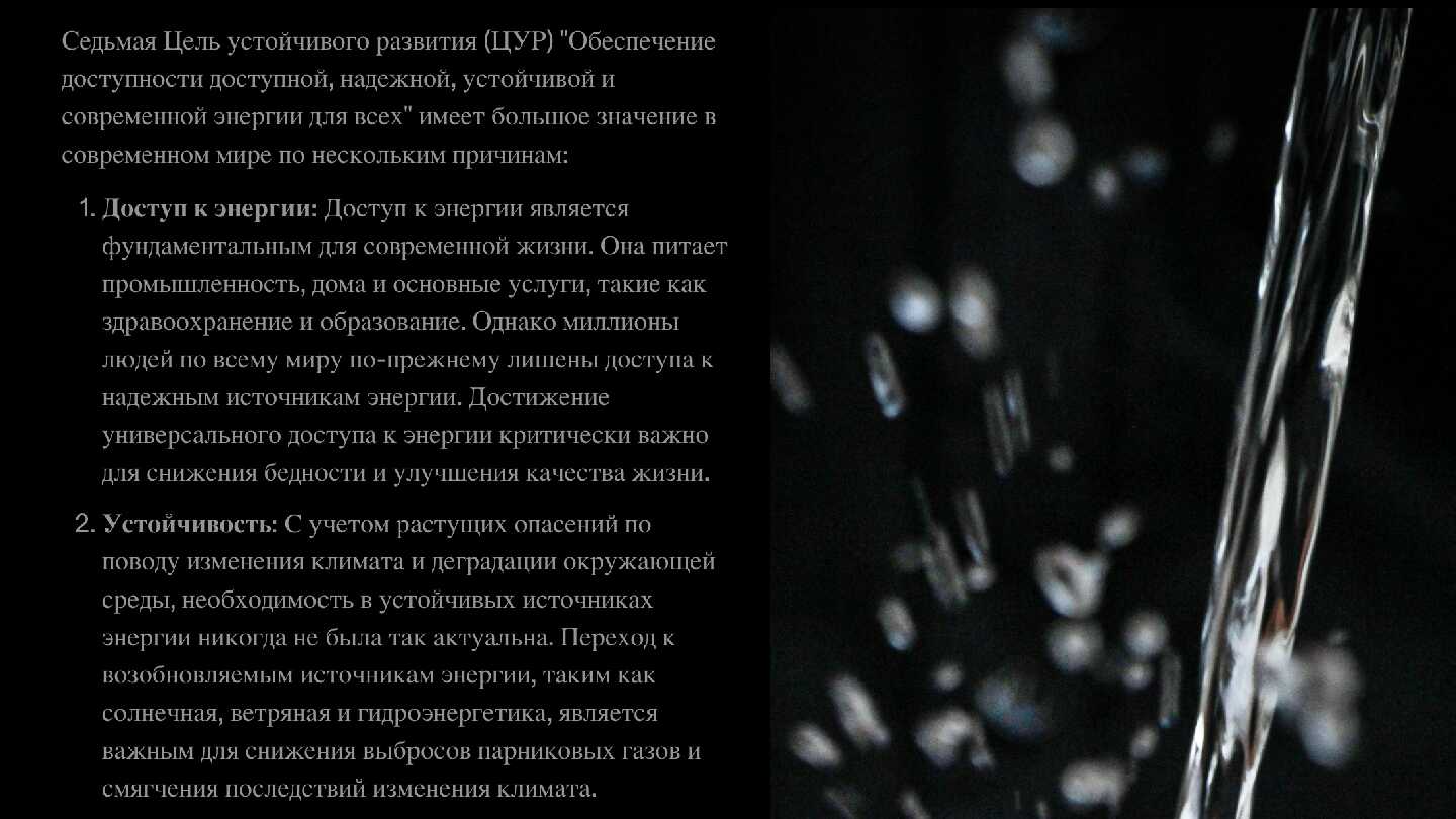 Презентация на тему "Решение проблемы обеспечиния доступности и устойчивого управления водой и санитарией для всех в Республике Казахстан". В данной презентации будет говориться о важности седьмой Цели Устойчивого Развития, анализе состояние водных ресурсов в Казахстане на сегодняшний день и возможных решениях проблемы устойчивого управления водными ресурсами.