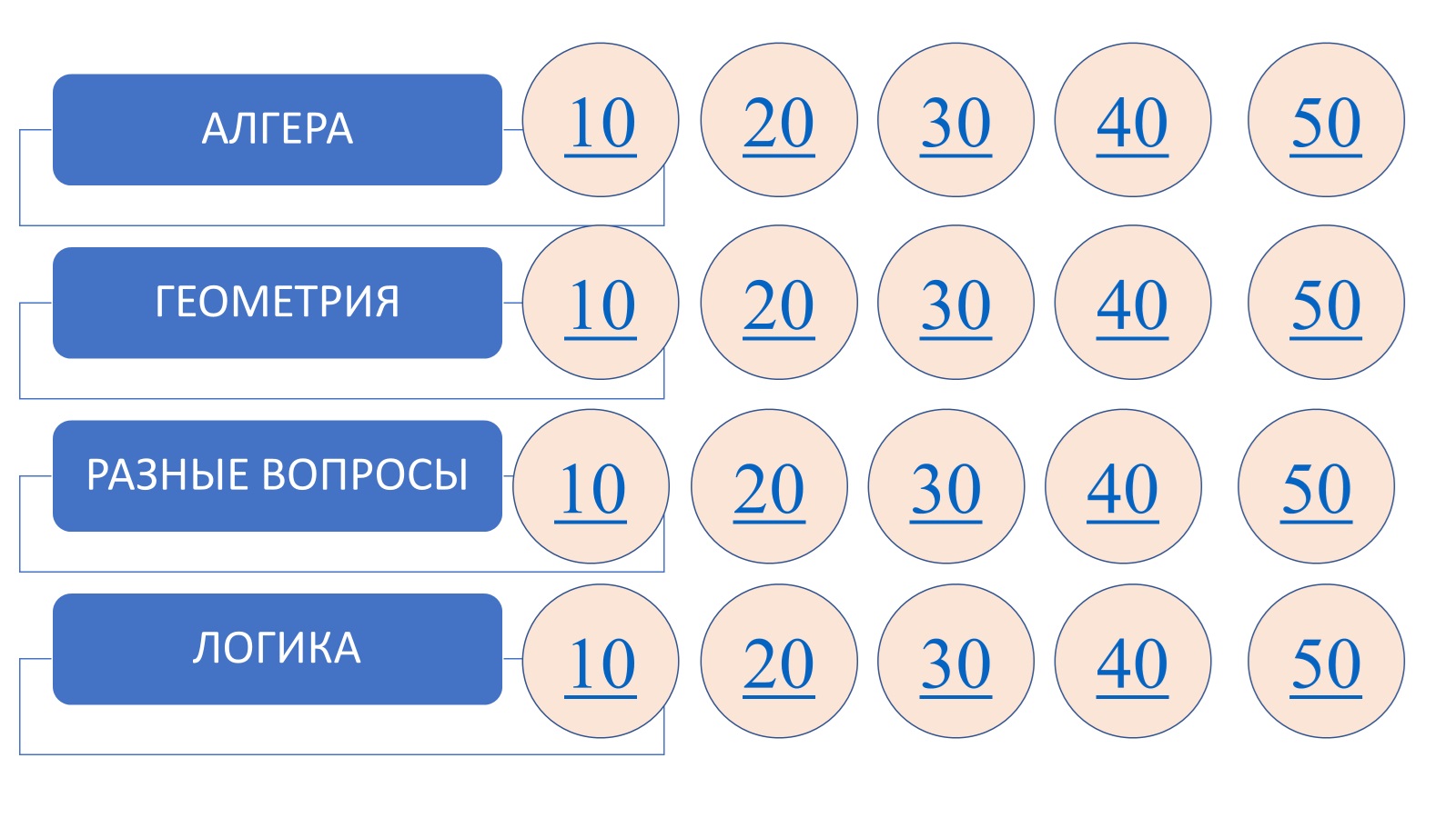 Математическая викторина - это интерактивная игра, предназначенная для проверки знаний математики учеников. В приложении представлены четыре категории вопросов с разными баллами (от 10 до 50 баллов).