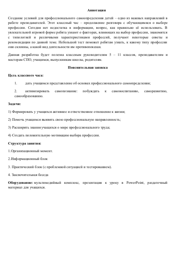 Создание условий для профессионального самоопределения детей – одно из важных направлений в работе преподавателей. Этот классный час – продолжение разговора с обучающимися о выборе профессии. Сегодня нет недостатка в информации, вопрос, как правильно её использовать. В увлекательной игровой форме ребята узнают о факторах, влияющих на выбор профессии, знакомятся с типологией и различными характеристиками профессий, получают некоторые советы и рекомендации по данной теме. Небольшой тест поможет ребятам узнать, к какому типу профессии они склонны, а какой вид деятельности им противопоказан.Данная разработка будет полезна классным руководителям 5 – 11 классов, преподавателям и мастерам СПО, учащимся, выпускникам школы, родителям.