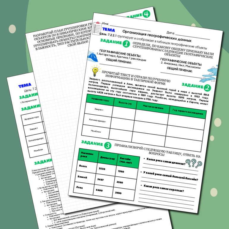 Рабочий лист С ОТВЕТАМИ по географии за 7 класс 1 четверть. Тема: Организация географических данных Цель: 7.2.2.1 группирует и отображает в таблицах географические объекты Авторский рабочий лист включает уникальные задания, разработанные с учетом возрастных особенностей учеников. Они направлены на углубление знаний, развитие аналитического мышления и подготовку к экзаменам. Рабочий лист идеально подходит для формативного оценивания, обеспечивая систематическое изучение материала и индивидуальную работу с учениками. Наличие ответов помогает учителям быстро проверять задания и дает ученикам возможность самостоятельно контролировать свои знания.