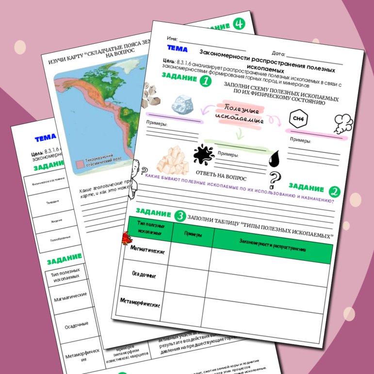 Рабочий лист С ОТВЕТАМИ по географии за 8 класс 1 четверть. Тема: Распространение полезных ископаемых в связи с закономерностями формирования горных пород и минералов Цель: 8.3.1.6 анализирует распространение полезных ископаемых в связи с закономерностями