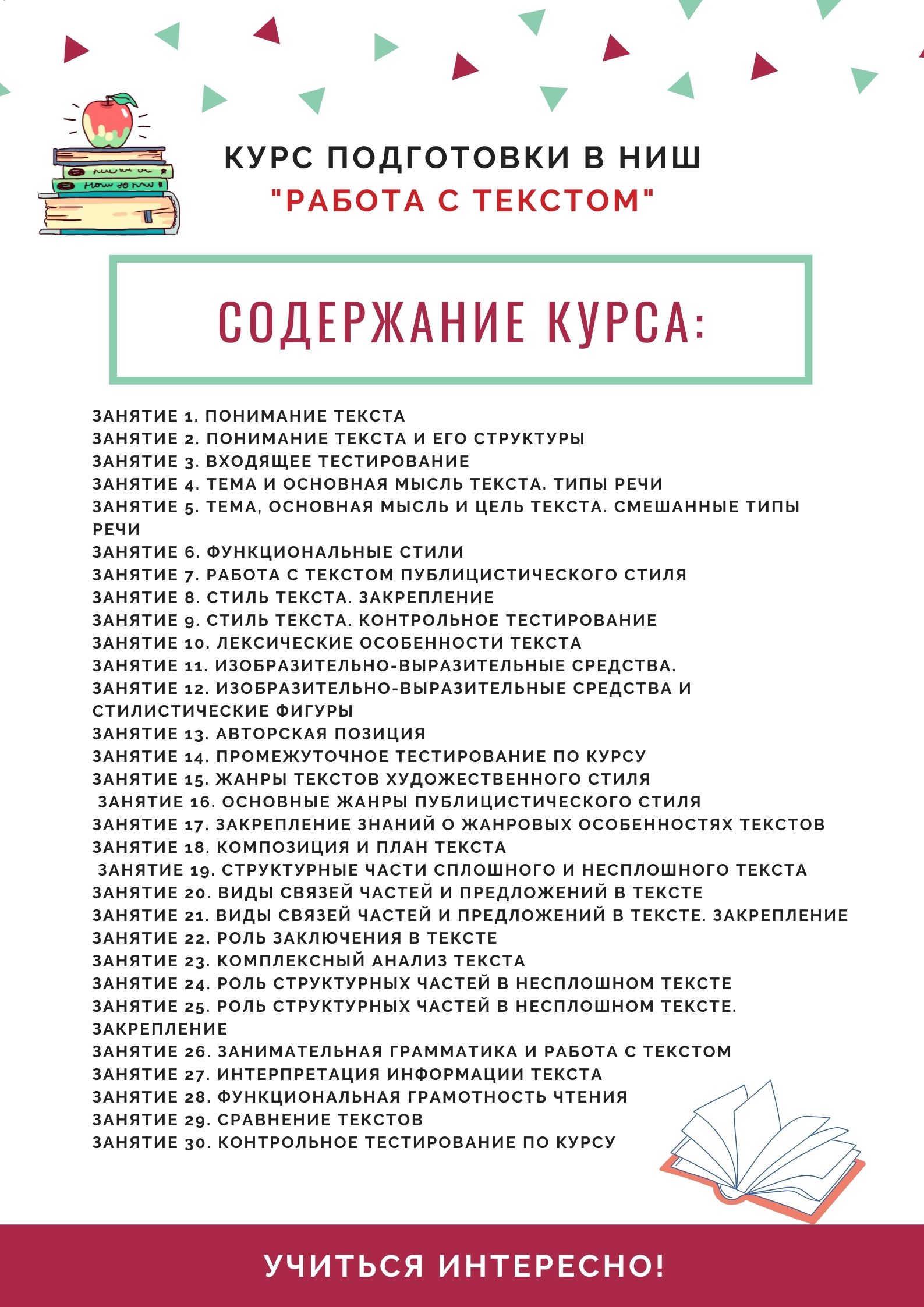 Курс содержит 30 занятий, более 500 тестовых вопросов к текстам разных стилей и жанров. Занятия расположены последовательно: от понимания текста, анализа его структуры и языковых особенностей до интерпретации и сравнения. Теория к каждому занятию включает понятия из стилистики и текстовых особенностей. Особо выделен материал для формирования функциональной грамотности чтения у учащихся, навыков анализа несплошных текстов. Данный ресурс апробирован на дополнительных занятиях для подготовки к поступлению в НИШ среди учеников 6-7 классов.