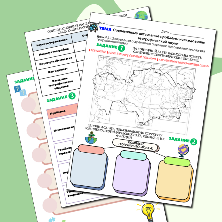 Рабочий лист С ОТВЕТАМИ по географии за 9 класс 1 четверть. Тема: Современные актуальные проблемы исследования географической науки Цель:: 9.1.1.2 определяет современные актуальные проблемы исследования географической науки Авторский рабочий лист включает уникальные задания, разработанные с учетом возрастных особенностей учеников. Они направлены на углубление знаний, развитие аналитического мышления и подготовку к экзаменам. Рабочий лист идеально подходит для формативного оценивания, обеспечивая систематическое изучение материала и индивидуальную работу с учениками. Наличие ответов помогает учителям быстро проверять задания и дает ученикам возможность самостоятельно контролировать свои знания.