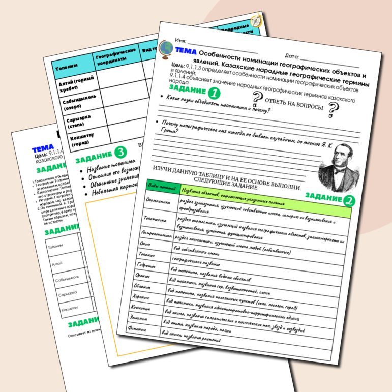 Рабочий лист С ОТВЕТАМИ по географии за 9 класс 1 четверть. Тема: Особенности номинации географических объектов и явлений. Казахские народные географические термины Цель: 9.1.1.3 определяет особенности номинации географических объектов и явлений; 9.1.1.4 объясняет значение народных географических терминов казахского народа Авторский рабочий лист включает уникальные задания, разработанные с учетом возрастных особенностей учеников. Они направлены на углубление знаний, развитие аналитического мышления и подготовку к экзаменам. Рабочий лист идеально подходит для формативного оценивания, обеспечивая систематическое изучение материала и индивидуальную работу с учениками. Наличие ответов помогает учителям быстро проверять задания и дает ученикам возможность самостоятельно контролировать свои знания.