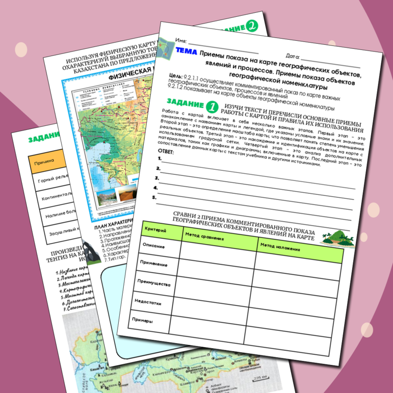 Рабочий лист С ОТВЕТАМИ по географии за 9 класс 1 четверть. Тема: Приемы показа на карте географических объектов, явлений и процессов. Приемы показа объектов географической номенклатуры Цель: 9.2.1.1 осуществляет комментированный показ по карте важных географических объектов, процессов и явлений 9.2.1.2 показывает на карте объекты географической номенклатуры Авторский рабочий лист включает уникальные задания, разработанные с учетом возрастных особенностей учеников. Они направлены на углубление знаний, развитие аналитического мышления и подготовку к экзаменам. Рабочий лист идеально подходит для формативного оценивания, обеспечивая систематическое изучение материала и индивидуальную работу с учениками. Наличие ответов помогает учителям быстро проверять задания и дает ученикам возможность самостоятельно контролировать свои знания.