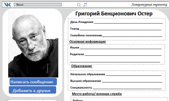 Рабочие листы представлены в виде начальной странички ВК. Дети читают или слушают биографию и заполняют "страничку автора". Данные странички помогают лучше запомнить теоретический материал, который сложно воспринимать в начальной школе. Дети в игровой форме занимаются поисковой деятельностью.