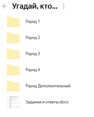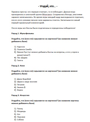 Забава по кадрам «Угадай, кто…» Игрокам даются кадры по различным темам. Часть изображения закрыта. Нужно угадать, что (или кто) скрыто. Кто первым отвечает, то и побеждает. Игру можно провести онлайн или в живом формате при работе с любой аудиторией. В игре 25 вопросов (кадров) по нескольким категориям: «Мультфильмы», «Кино, «Искусство», «Пройдемся по названиям» и «Дополнительный раунд».