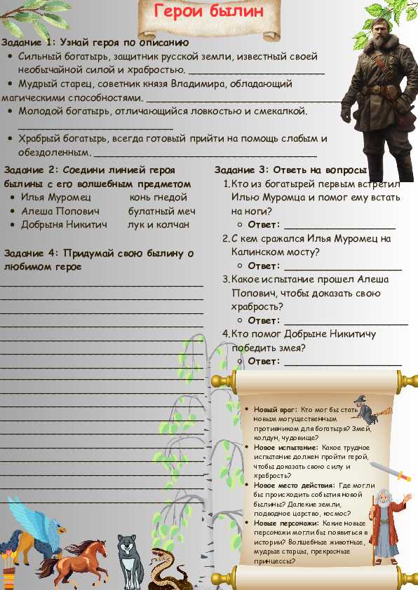 Рабочий лист предназначен для учащихся и направлен на углубление знаний о русских былинах. Задания разнообразны по уровню сложности и охватывают различные аспекты изучения материала.
