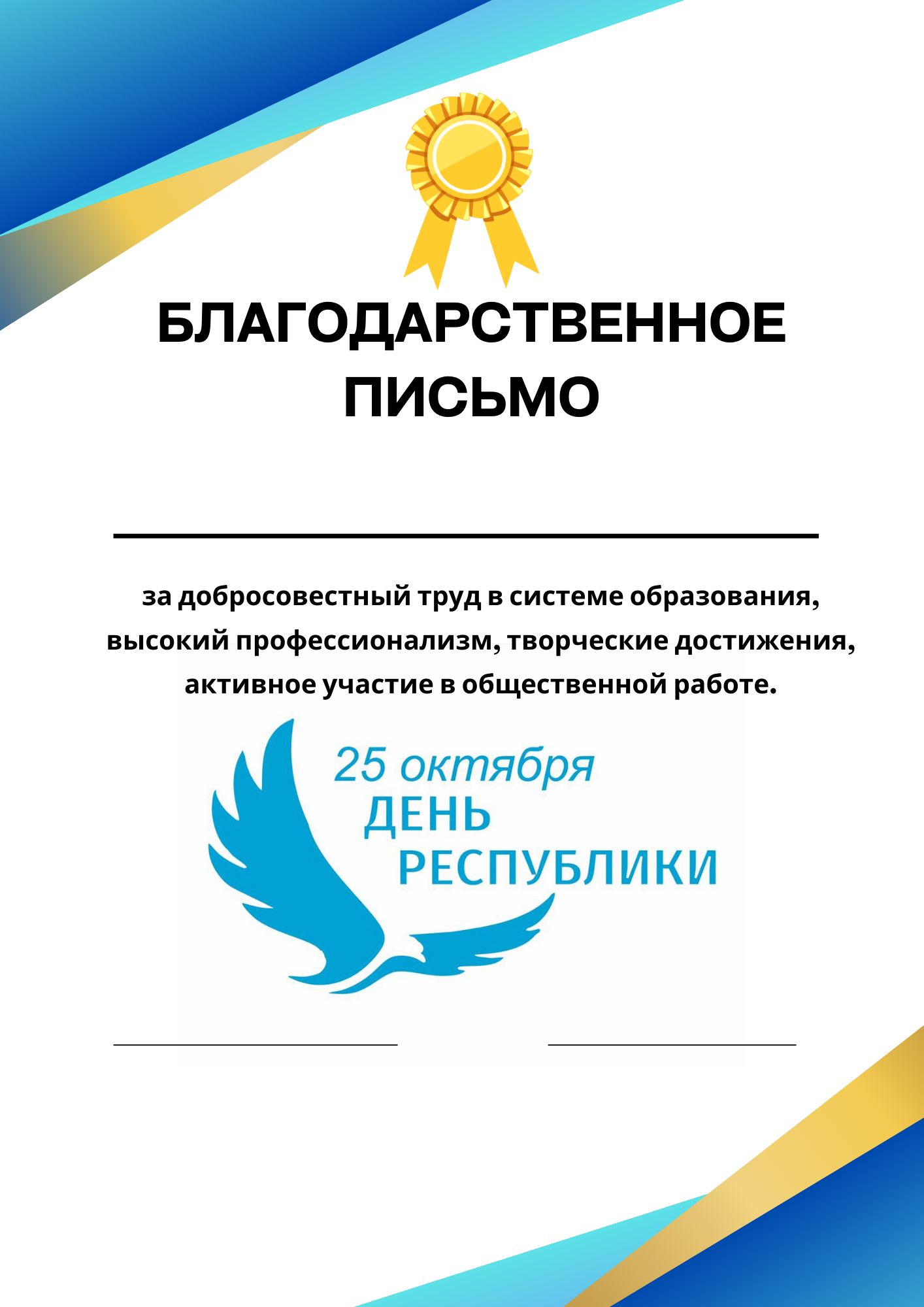 Благодарственное письмо День Республики Казахстан учителям, руководителям, директорам.