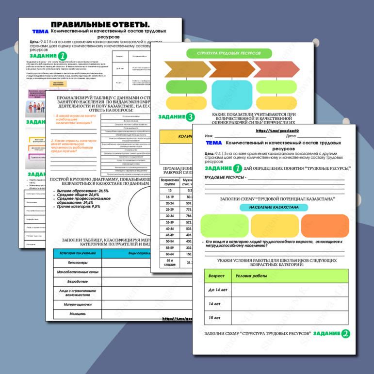 Рабочий лист С ОТВЕТАМИ по географии за 9 класс 3 четверть. Тема: Количественный и качественный состав трудовых ресурсов Цель: 9. 4. 1. 5 на основе сравнения казахстанских показателей с другими странами дает оценку количественному и качественному составу трудовых ресурсов. Авторский рабочий лист включает уникальные задания, разработанные с учетом возрастных особенностей учеников. Они направлены на углубление знаний, развитие аналитического мышления и подготовку к экзаменам. Рабочий лист идеально подходит для формативного оценивания, обеспечивая систематическое изучение материала и индивидуальную работу с учениками. Наличие ответов помогает учителям быстро проверять задания и дает ученикам возможность самостоятельно контролировать свои знания.