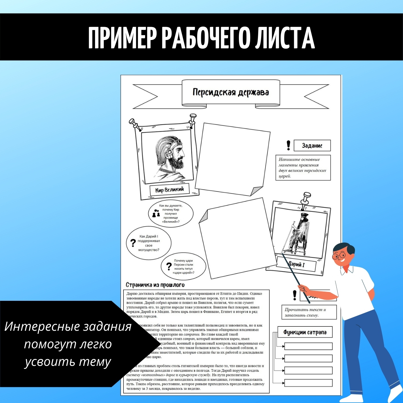 Каждый рабочий лист состоит из интересных заданий по теме, текстов об исторической личности или об историческом событии, явлении. К текстам и картам есть сопроводительные вопросы.