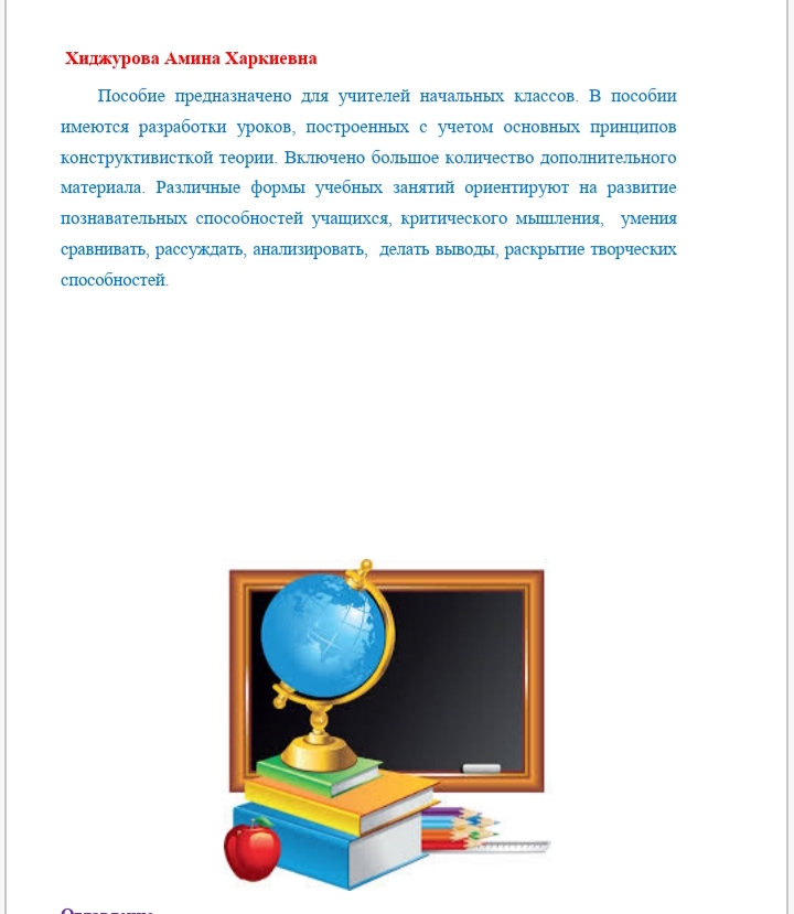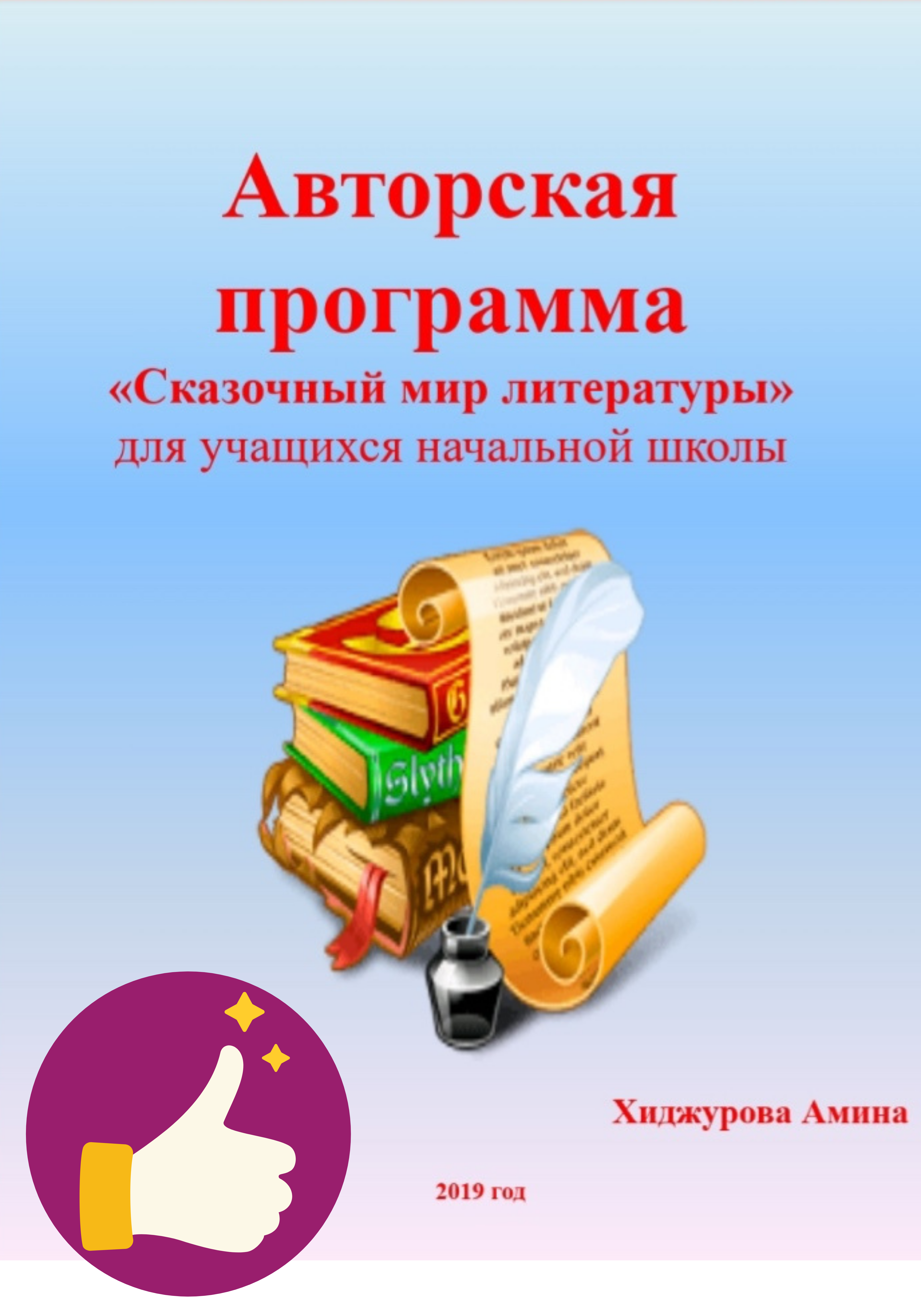 Программа «Сказочный мир литературы» разработана учителем начальных классов категории педагог-мастер Хиджуровой А. Х.; рецензирована профессором Д. П. Н. кафедры «Педагогика и психология» Таразского инновационно – педагогического университета Ж. Т. Сарыбековой, доцентом К. П. Н. кафедры «Начальное обучение и ИЗО» ТИГУ А. С. Курманбековой.