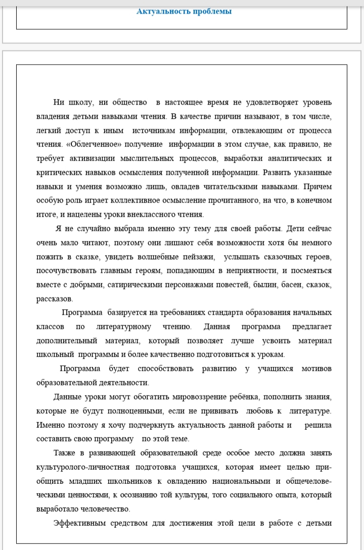 Авторская программа «Сказочный мир литературы» ориентирована на достижение целей и задач современного начального образования в соответствии с новыми образовательными стандартами; отражает конкретный круг актуальных вопросов образования; составлена с учётом дидактических принципов обучения и возрастных особенностей детей младшего школьного возраста. По своей структуре программа представляет собой учебно-методическое пособие, рабочую тетрадь, а также среднесрочное и краткосрочное планирование. Основное содержание рабочей тетради структурировано по темам. Кроме того, в рабочей тетради даны подробные алгоритмы действий. Материал подобран в соответствии не только с возрастными особенностями, но и с интересами детей. Смена видов деятельности, использование качественно иллюстрированного материала, представленного в рабочей тетради, способствует формированию читательской компетенции младшего школьника, повышает мотивацию к обучению, развивает творческие способности личности ребёнка, стимулирует его познавательную деятельность.
