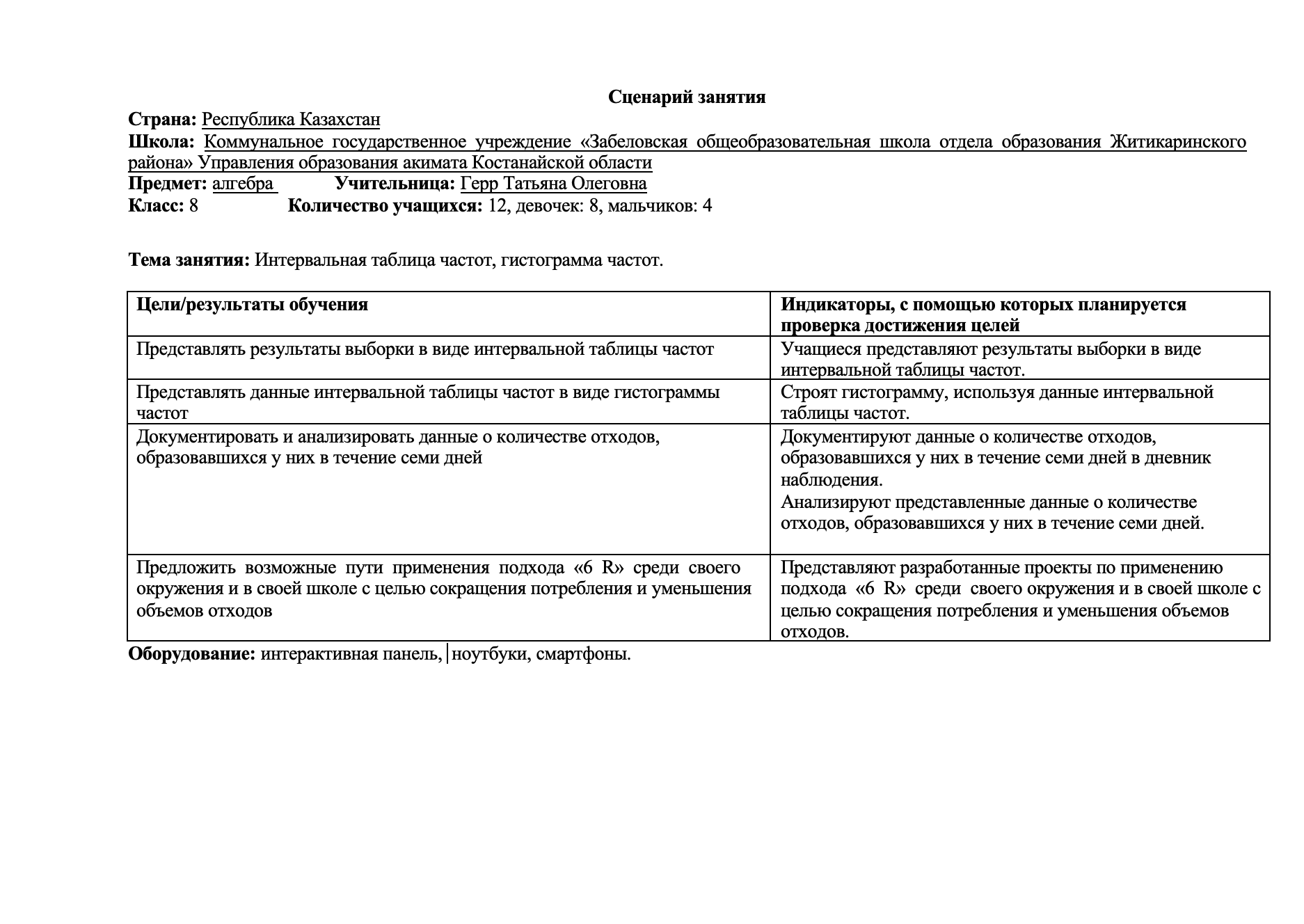 Сценарий занятия к предмету "Алгебра", 8 класс. Тема: "Интервальная таблица частот, гистограмма частот"