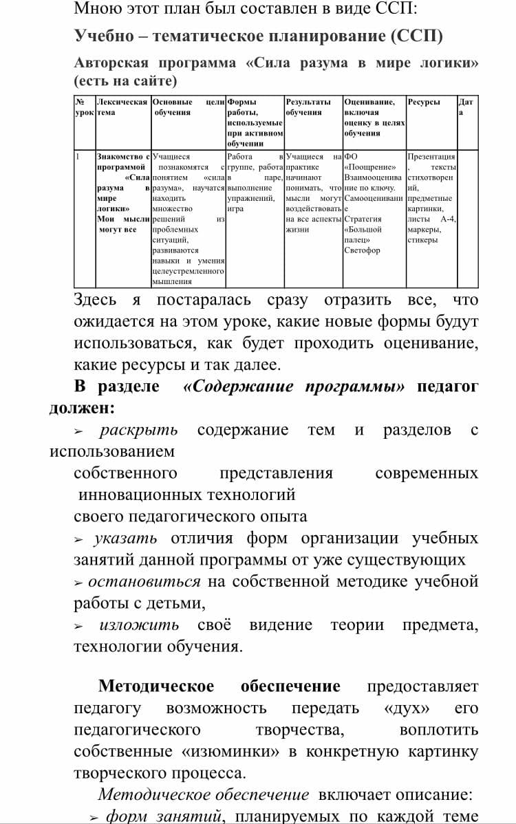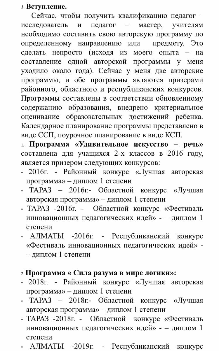 У меня две авторские программы, и обе программы являются призерами районного, областного и республиканских конкурсов. Мои программы составлены в соответствии обновленному содержанию образования, внедрено критериальное оценивание образовательных достижений ребенка. Календарное планирование программ представлено в виде ССП, поурочное планирование в виде КСП.