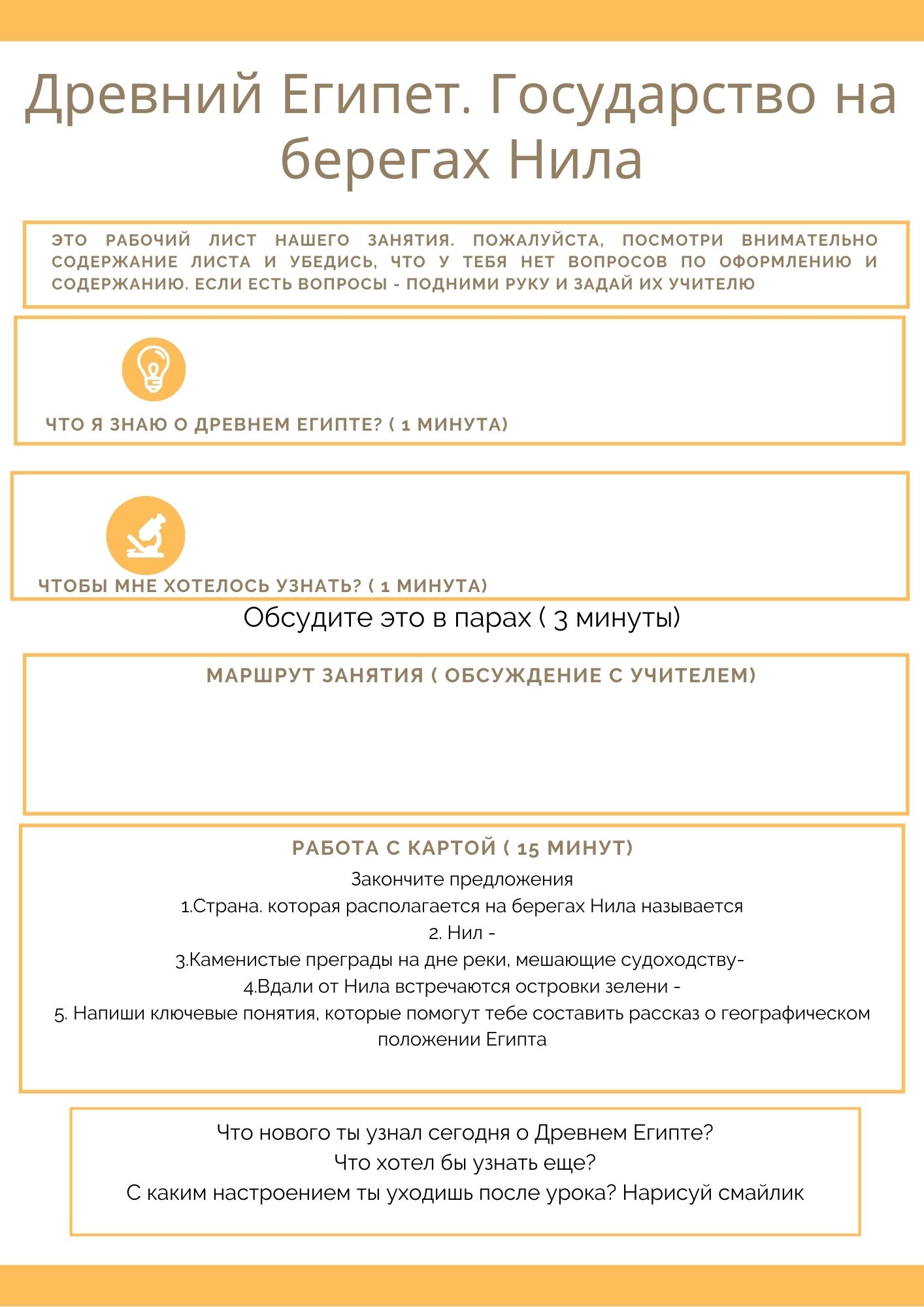 Рабочий лист по теме "Древний Египет. Государство на берегах Нила" подходит для первого знакомства с материалом. В листе также можно увидеть структуру урока, что сэкономит время учителя на его подготовку. Задания рабочего листа направлены на понимание учениками темы урока