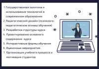 Изучив данное пособие вы будете: знать основы разработки структуры учебного курса, учебных материалов и средств оценивания; иметь представление о психолого-педагогических основах обучения; существующих технологиях обучения, организации учебного процесса и мотивации обучающихся; уметь планировать программу и технологическую карту курса; разрабатывать учебные материалы, интерактивные виды заданий и оценочные средства в электронной среде, в том числе доступные для лиц с ОВЗ.