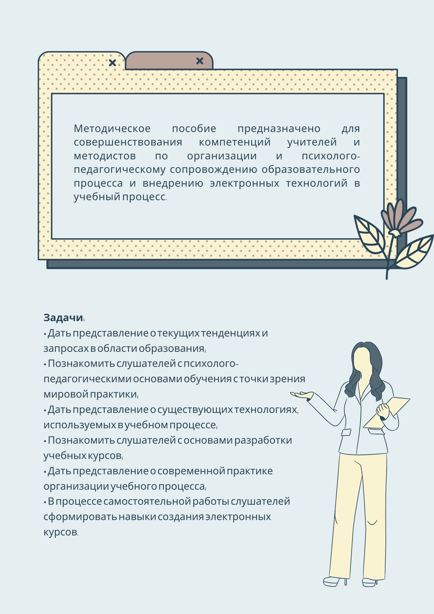 Для вас материалы по разработке электронного и смешанного обучения собраны в методическое пособие. Оно предназначено для совершенствования компетенций учителей и методистов по организации и психолого-педагогическому сопровождению образовательного процесса и внедрению электронных технологий в учебный процесс.