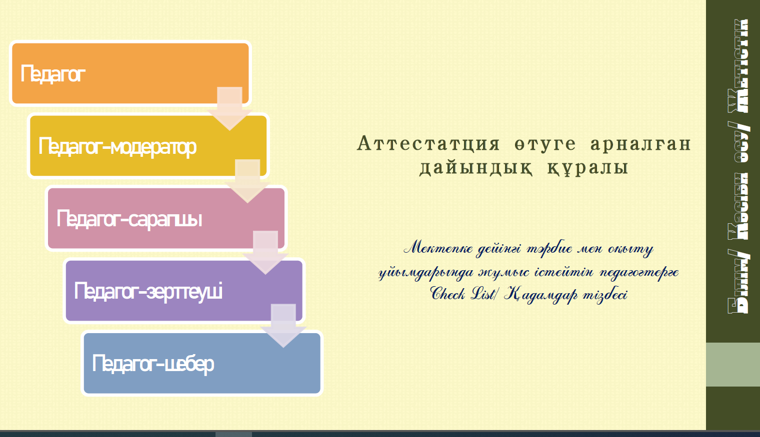 Аттестатция өтуге арналған дайындық құралы (Мектепке дейінгі тәрбие мен оқыту ұйымдарында жұмыс істейтін педагогтерге Check List/ Қадамдар тізбесі)