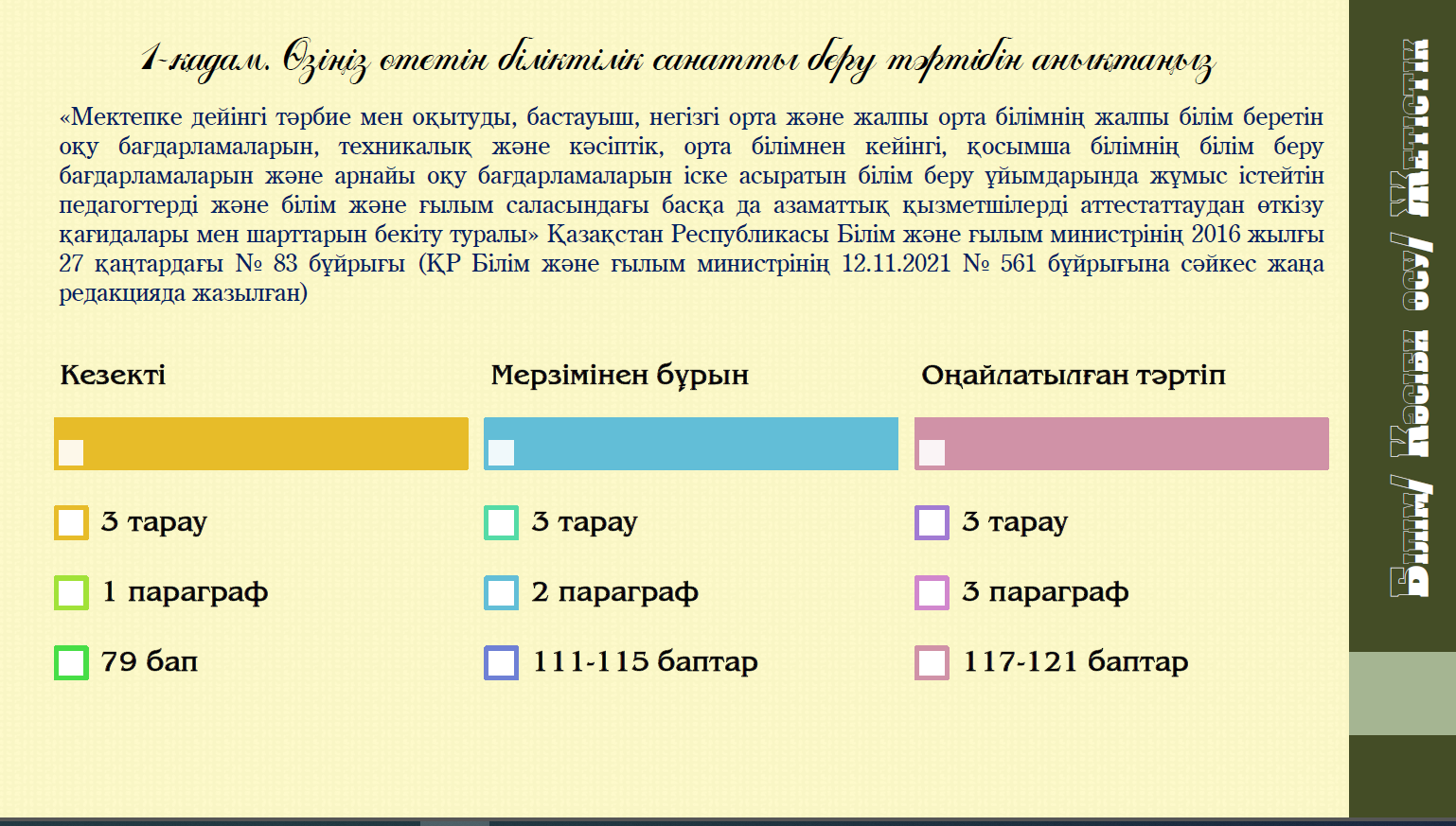 Қазақстан Республикасы педагогтарының біліктілік санаттарын тағайындау «Мектепке дейінгі тәрбие мен оқытуды, бастауыш, негізгі орта және жалпы орта білімнің жалпы білім беретін оқу бағдарламаларын, техникалық және кәсіптік, орта білімнен кейінгі, қосымша білімнің білім беру бағдарламаларын және арнайы оқу бағдарламаларын іске асыратын білім беру ұйымдарында жұмыс істейтін педагогтерді және білім және ғылым саласындағы басқа да азаматтық қызметшілерді аттестаттаудан өткізу қағидалары мен шарттарын бекіту туралы» Қазақстан Республикасы Білім және ғылым министрінің 2016 жылғы 27 қаңтардағы № 83 бұйрығы негізінде жүзеге асады.