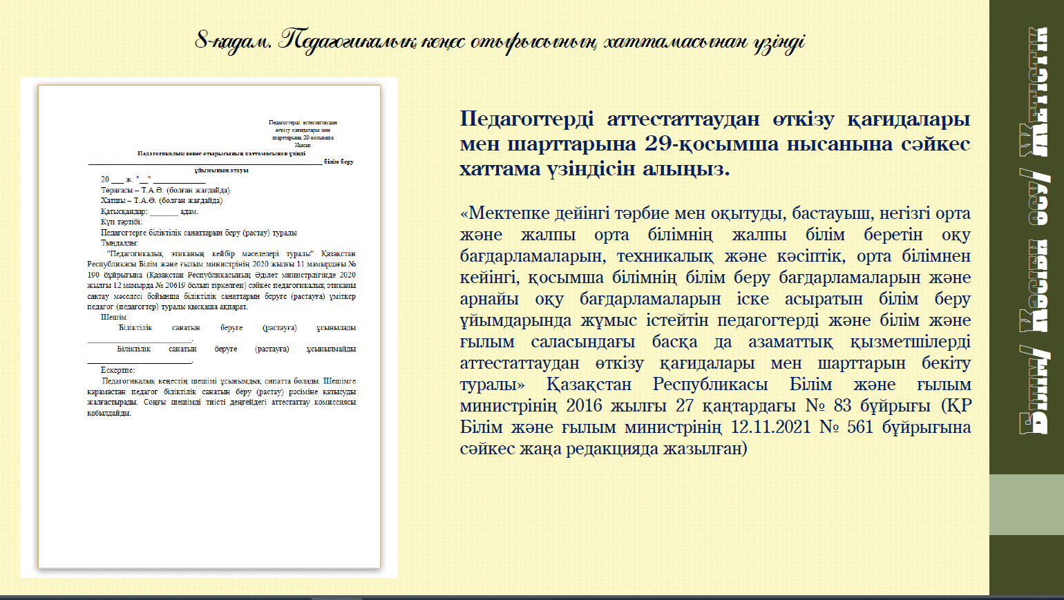 2022 жылдан бастап педагогтерді аттестаттаудан өткізу қағидалары мен шарттары ҚР Білім және ғылым министрінің 12.11.2021 № 561 бұйрығына сәйкес жаңа редакцияда жазылған Қағидалар бойынша жүргізіледі.