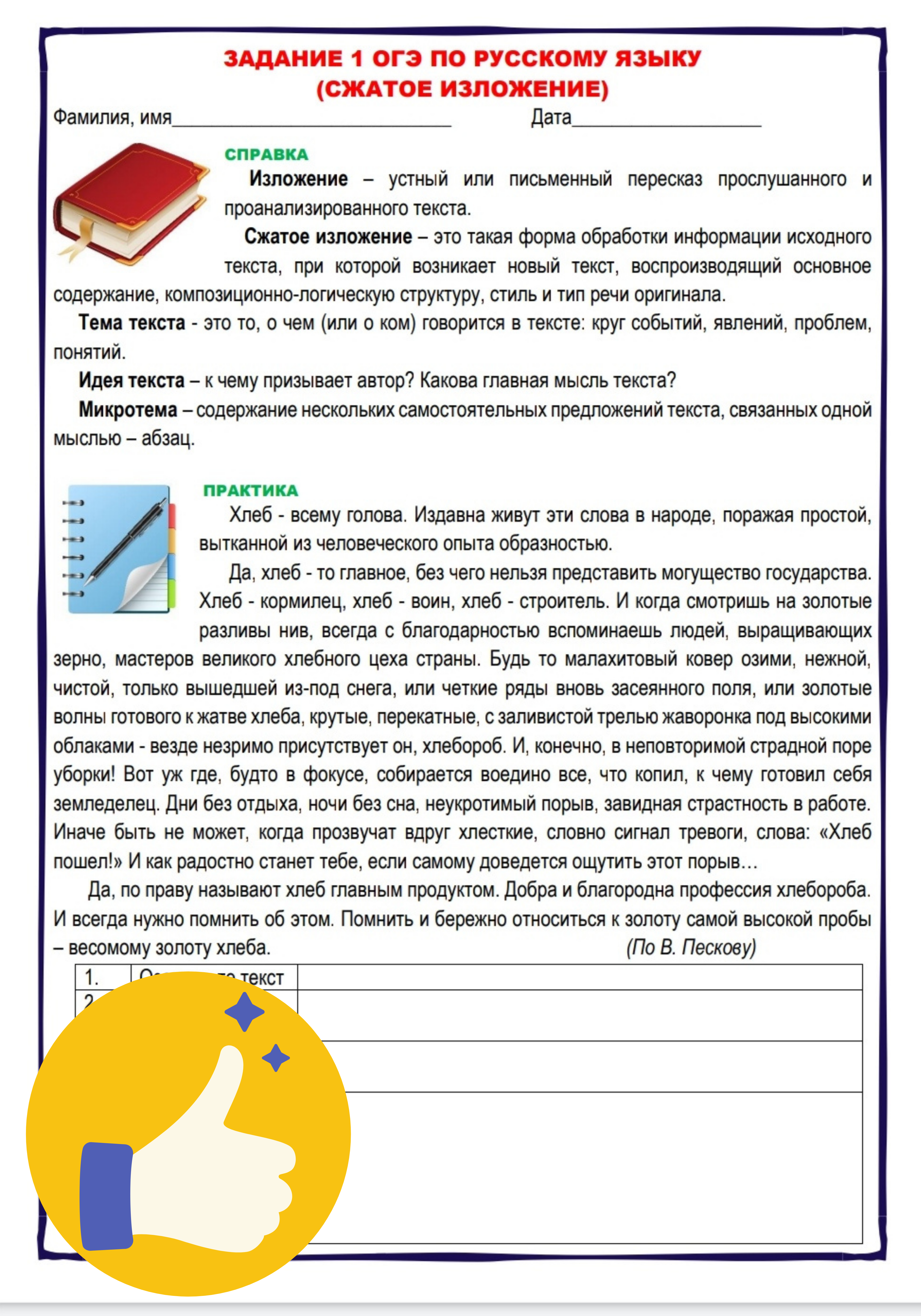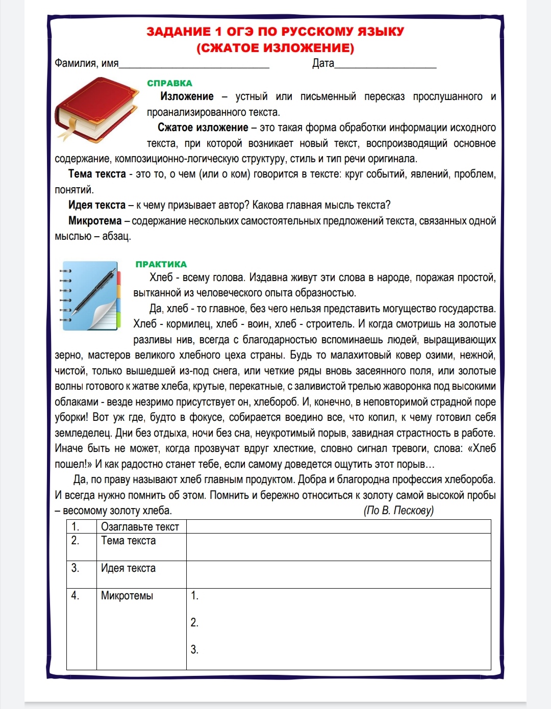 Рабочие листы "Подготовка к сжатому изложению ОГЭ"