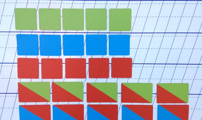 Квадратные карточки обозначают отдельную букву, а прямоугольные – слог. Для обозначения звуков использовано традиционное цветовое кодирование (гласный звук обозначается красным цветом, твердый согласный – синим, мягкий согласный – зеленым).