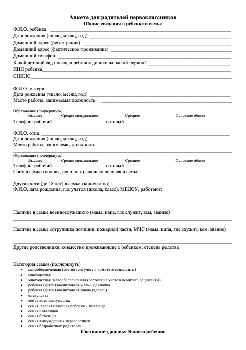 Стандартная анкета для родителей