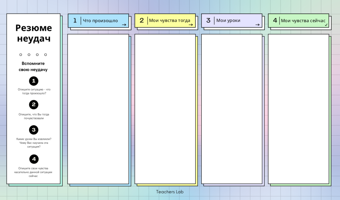 Она просит их написать резюме своих неудач, то есть документ, в котором перечислены их самые большие ошибки - личные, профессиональные или научные. В отношении каждой неудачи они должны отметить, чему их научил этот опыт.
