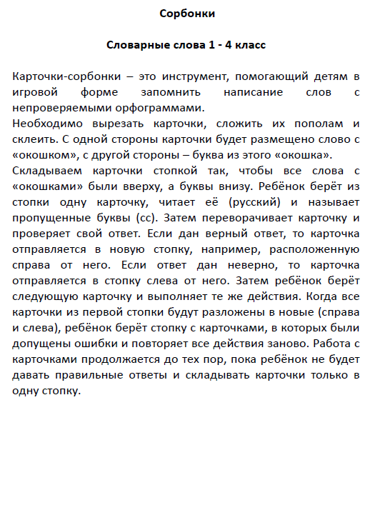 Карточки-сорбонки – это инструмент, помогающий детям в игровой форме запомнить написание слов с непроверяемыми орфограммами. Файл содержит 225 карточек со словами.